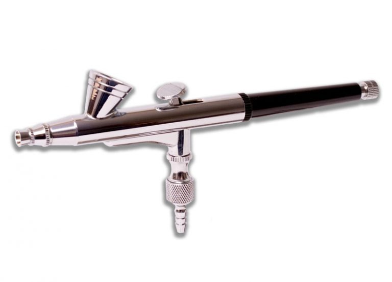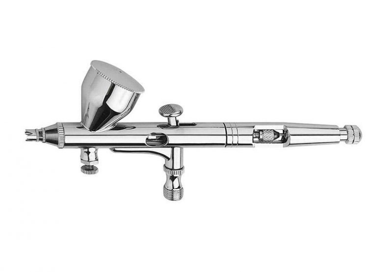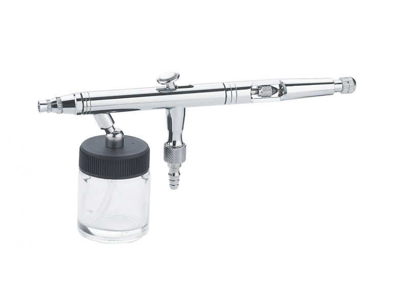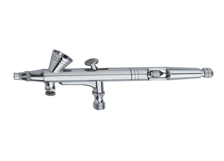 This dual-action airbrush allows pressing the trigger to activate airflow and pulling the trigger to control paint release, enabling very fine lines (1 mm or less) in skilled hands, with a maximum spray pattern of approximately 40 mm depending on the distance to the surface.