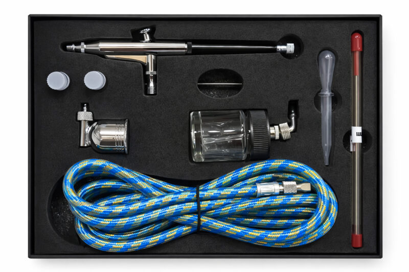 The HS34 side feed airbrush kit features a 7cc gravity side-fed cup and a 22cc glass suction-fed bottle, making it a versatile choice for a wide range of airbrushing applications. Perfect for fine detail work, large-area coverage, and angled spraying thanks to its side feed design.