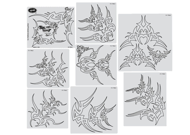 The Tribal Masters II Cornered Set includes 48 solvent-proof templates, combining both positive and negative designs. Each of the eight original patterns comes in three different sizes, giving you unmatched flexibility and precision. Made from durable, solvent-proof polymer, these stencils can be flexed or curved around irregular surfaces without damage.