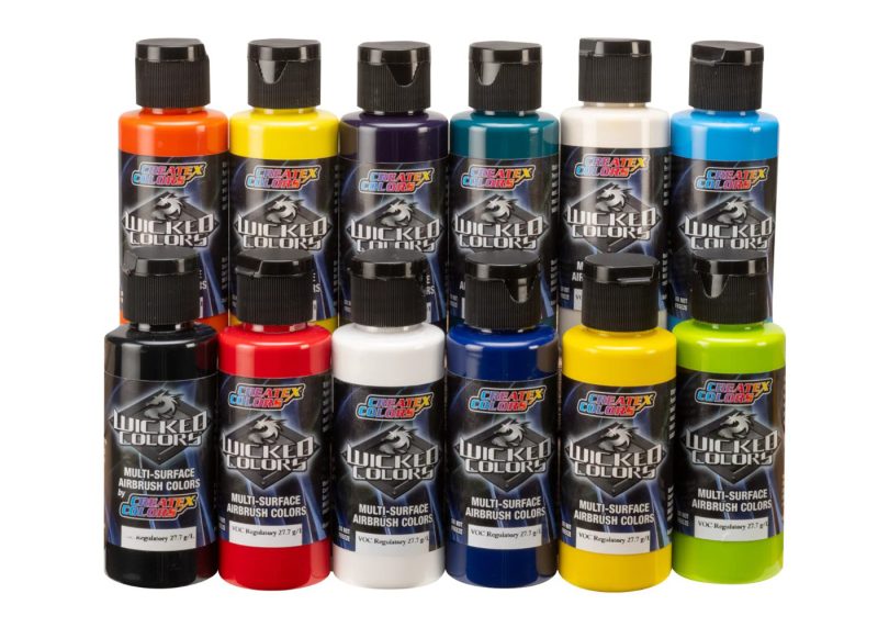 This set of Wicked Opaque Airbrush Colors includes water-based, multi-surface acrylic paints that are perfect for any airbrush or spray-gun project. Made with opaque, lightfast pigments and a durable resin, these paints are suitable for both interior and exterior use (exterior applications require a top clear coat, such as UVLS Clears).