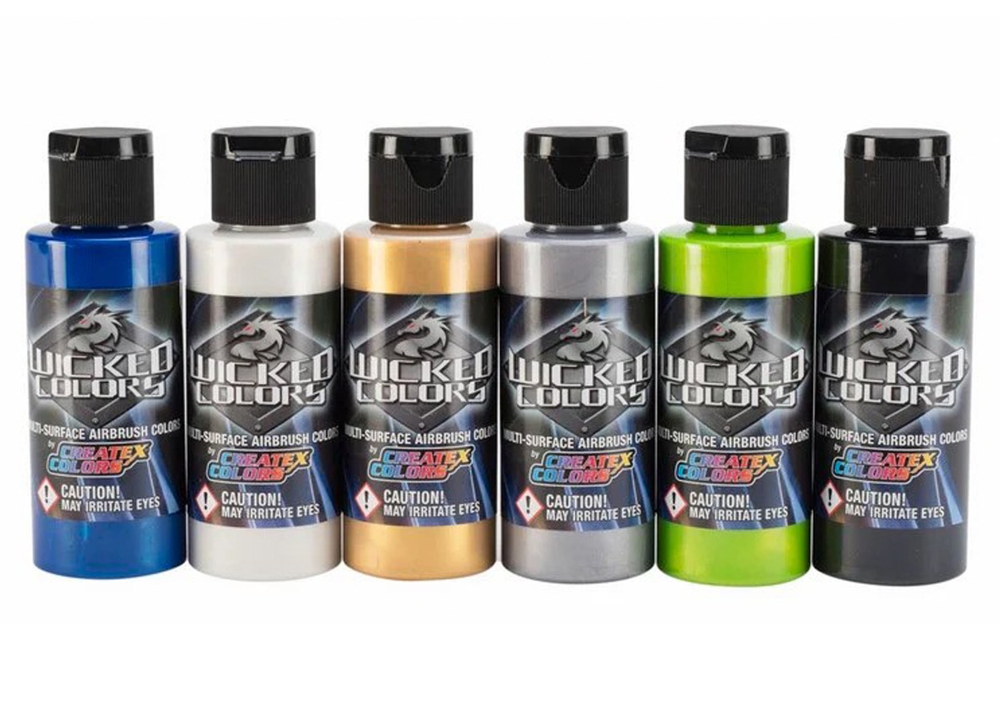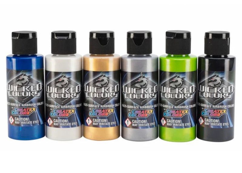 This set of Wicked Pearlescent Airbrush Colors contains water-based, multi-surface acrylic paints that are suitable for a wide range of airbrush projects and spray-gun applications. Made with transparent pearl powders and a durable resin, these paints are excellent for both interior and exterior use (exterior use requires a top coat clear, such as UVLS Clears).