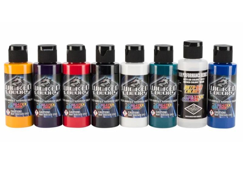 This set of Wicked Airbrush Colors contains water-based, multi-surface acrylic paints suitable for any airbrush or spray-gun project. Made with lightfast pigments and a durable resin, these paints are excellent for both interior and exterior use (exterior applications require a top clear coat, such as UVLS Clears).