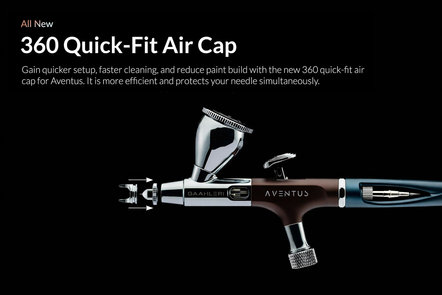 The all-new 360 Quick-Fit air cap system simplifies setup and cleaning, reduces paint buildup, and helps protect the needle for longer life and reliability.