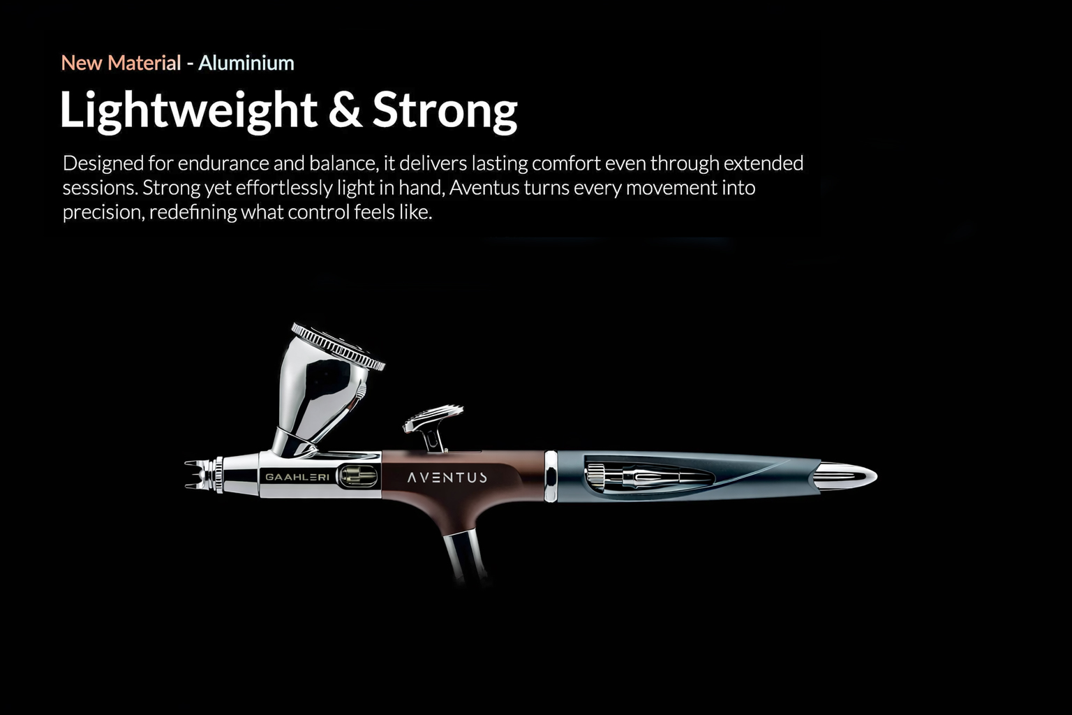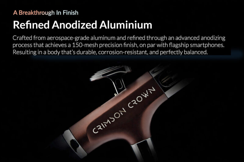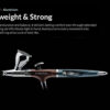 Milled from aerospace-grade aluminium and finished in a refined anodised Crimson Crown surface, the body is light, durable, and perfectly balanced. Its uninterrupted contours feel natural in hand, helping reduce fatigue during long painting sessions.