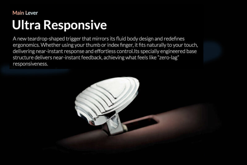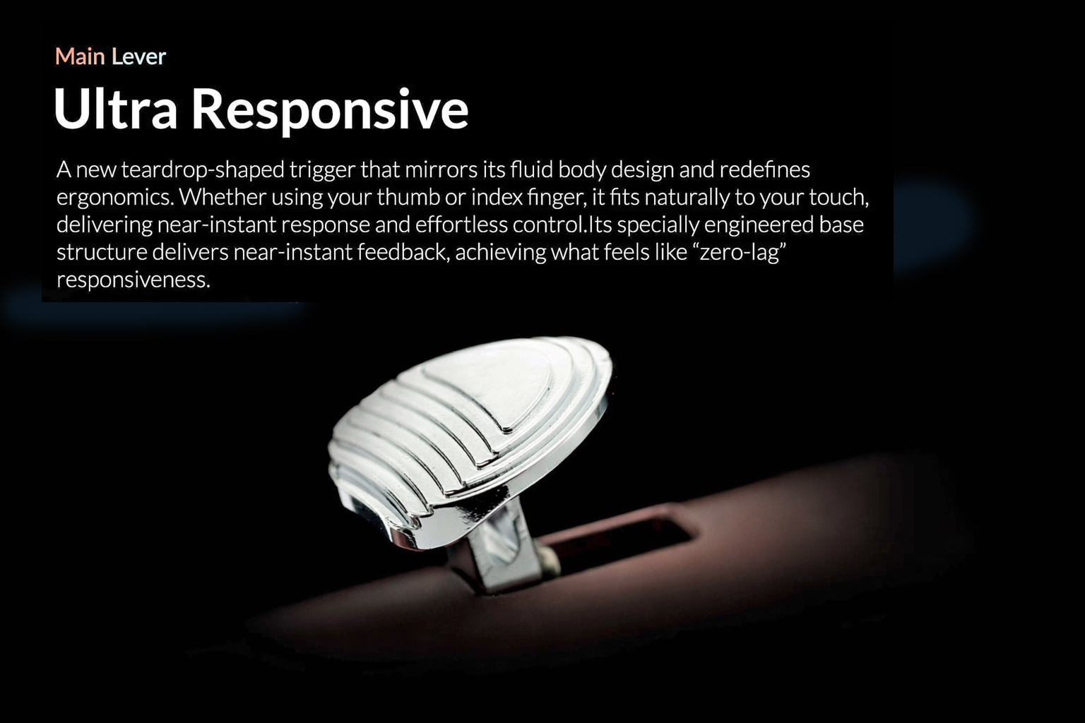 An ultra-responsive teardrop-shaped trigger provides smooth, linear movement and near-instant feedback — making every action feel direct and intuitive.