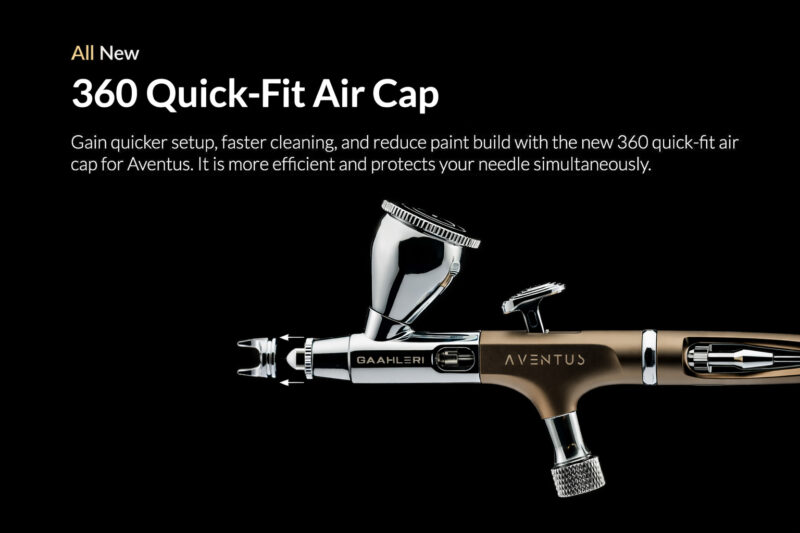 The all-new 360 Quick-Fit air cap system simplifies setup and cleaning, reduces paint buildup, and helps protect the needle for longer life and reliability.
