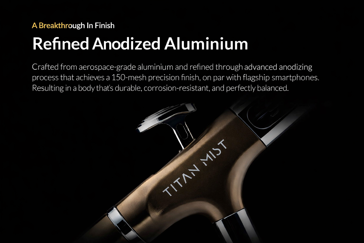 Milled from aerospace-grade aluminium and finished in a refined anodised Titan Mist surface, the body is light, durable, and perfectly balanced. Its uninterrupted contours feel natural in hand, helping reduce fatigue during long painting sessions.