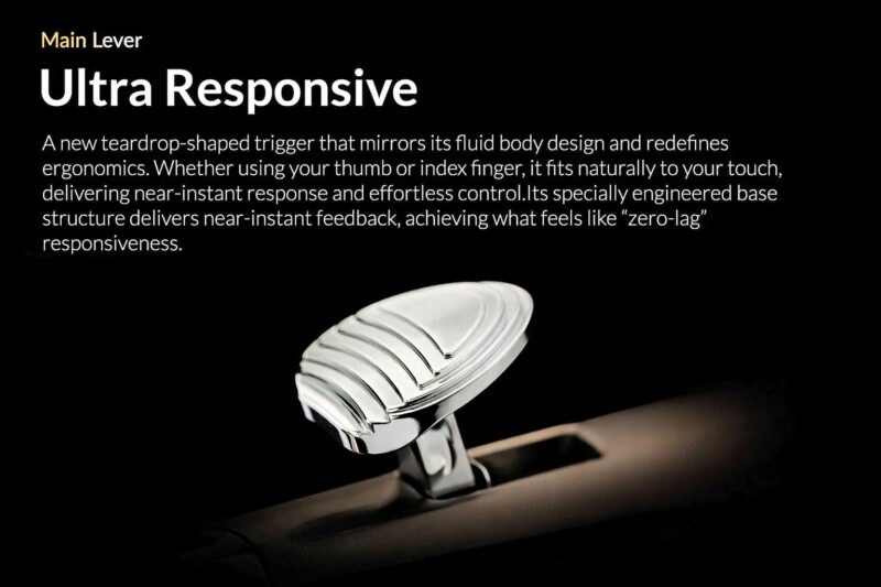 An ultra-responsive teardrop-shaped trigger provides smooth, linear movement and near-instant feedback — making every action feel direct and intuitive.