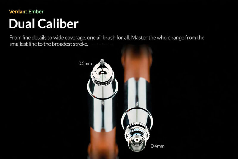 • Dual-calibre airbrush with 0.2 mm and 0.4 mm nozzles for both fine detail and smooth base coats.