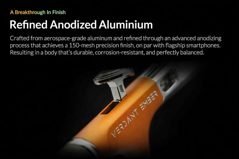 Milled from aerospace-grade aluminium and finished in a refined anodised Verdant Ember surface, the body is light, durable, and perfectly balanced. Its uninterrupted contours feel natural in hand, helping reduce fatigue during long painting sessions.