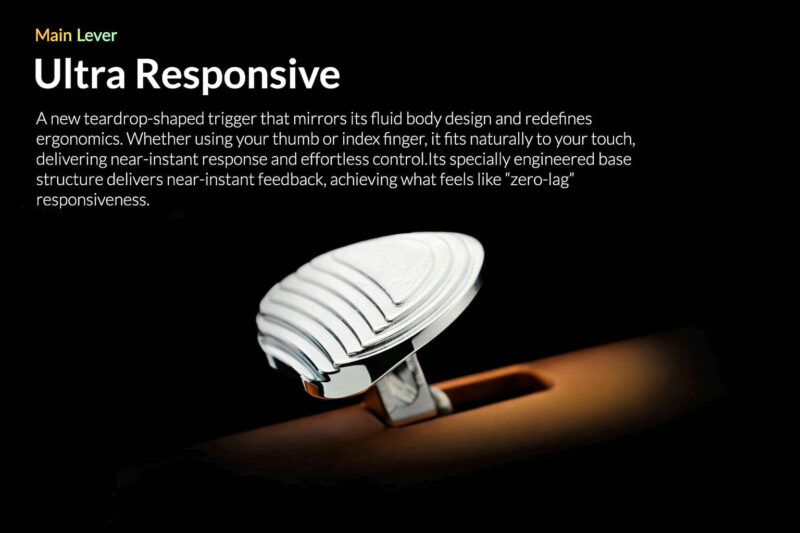 An ultra-responsive teardrop-shaped trigger provides smooth, linear movement and near-instant feedback — making every action feel direct and intuitive.