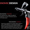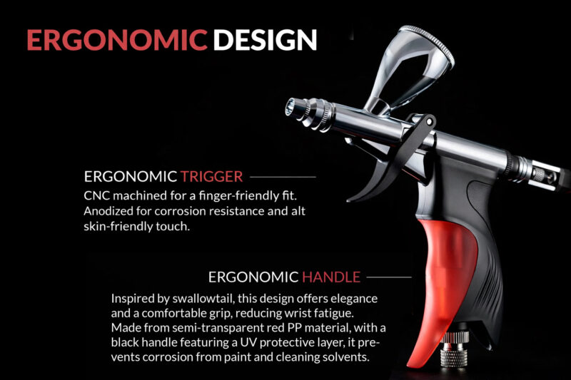 - Ergonomic Swallowtail Handle: Specifically designed for maximum comfort across all hand sizes, even during long airbrushing hours. The extended tail provides a resting point for the pinky, aiding in micro-movements for improved precision.