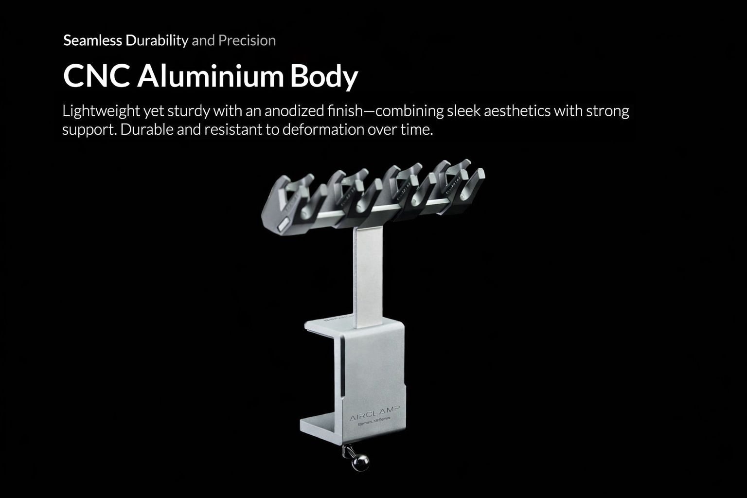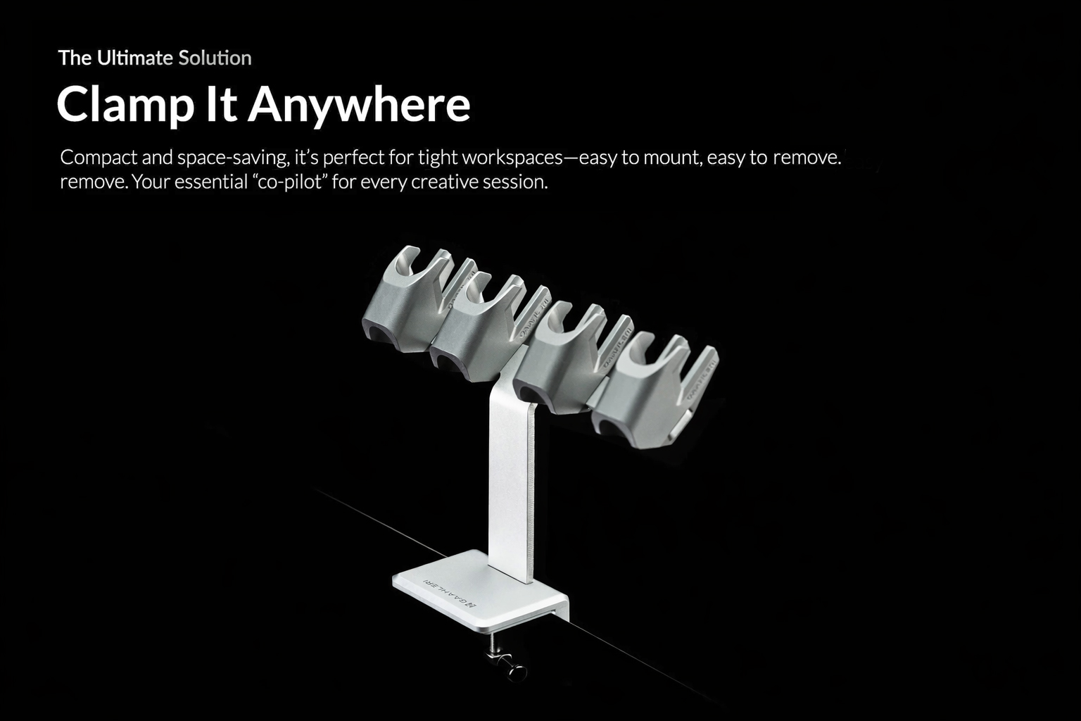 Crafted from CNC-machined aluminium, it features a reinforced threaded knob and anti-slip nano-pad to securely mount to desktops and work surfaces up to 5 cm thick without causing damage. Designed to hold up to 4 airbrushes of various shapes and sizes, it keeps your tools organised and within reach. Compatible with Gravity Feed, Side Feed, and Siphon Feed airbrushes.