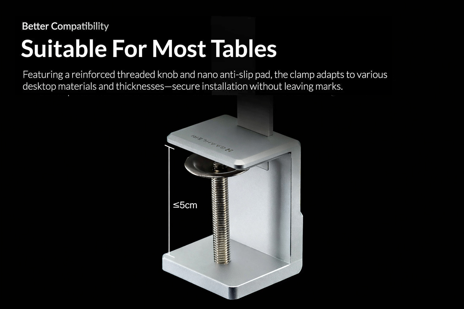 - Secure Surface Mounting: Clamps firmly onto desktops and work surfaces up to 5 cm thick with the anti-slip pad protecting surfaces.