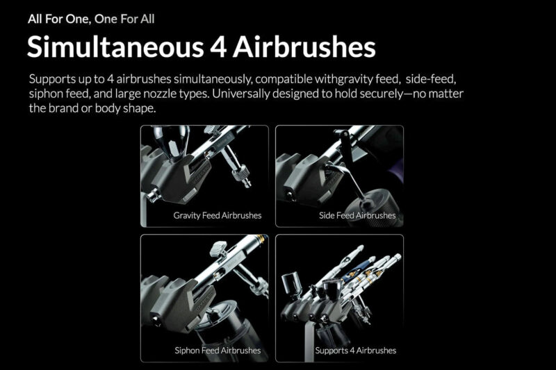 - Holds Multiple Airbrushes: Supports up to 4 airbrushes at once, including Gravity Feed, Side Feed, and Siphon Feed models.