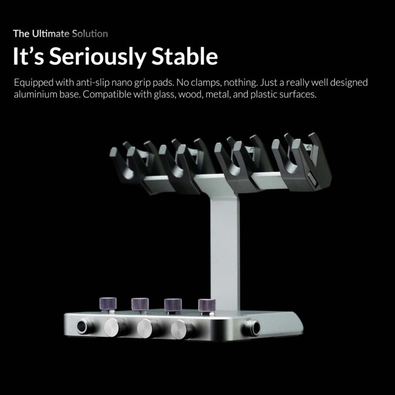 Milled from a single block of high‑grade anodised aluminium, it supports up to four airbrushes simultaneously and puts full control of your workflow at your fingertips. Equipped with four independent PSI regulators and a secure anti‑slip nano‑pad base, this system gives you instant switching between airbrushes, nozzle sizes and painting styles—without re‑configuring your compressor.