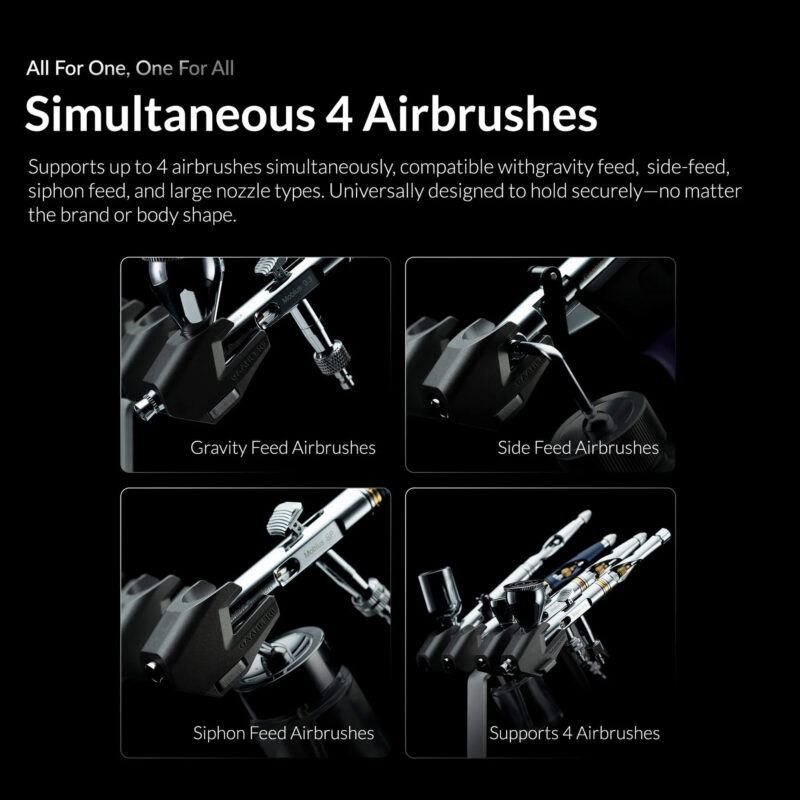 - Supports Four Airbrushes at Once: Holds up to four airbrushes of varying brands and styles, including gravity‑feed, side‑feed and siphon‑feed models.