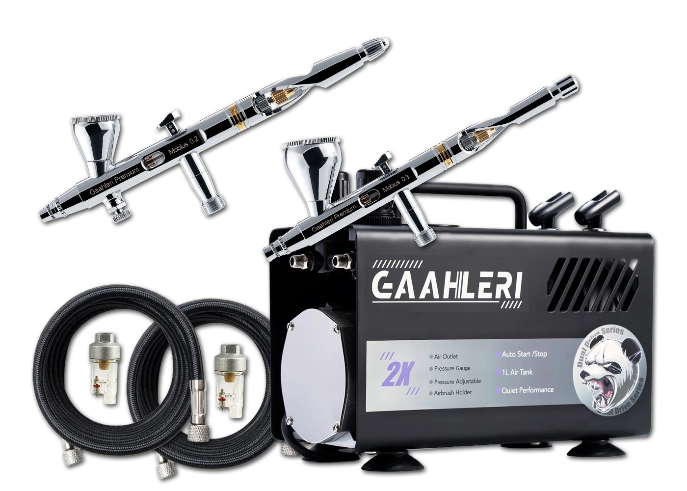 This is a general-purpose starter kit offering exceptional value and performance. It’s a complete package featuring the Gaahleri GT-918 Mini Single Piston on-demand compressor with an integrated 1-litre air tank, two 1.8-meter braided air hoses, two pistol grip moisture filters, and two Mobius double-action gravity feed airbrushes.