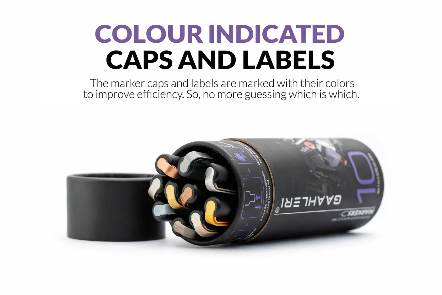 Each marker features colour-indicated caps and labels for quick and easy identification—no more guessing the shade.