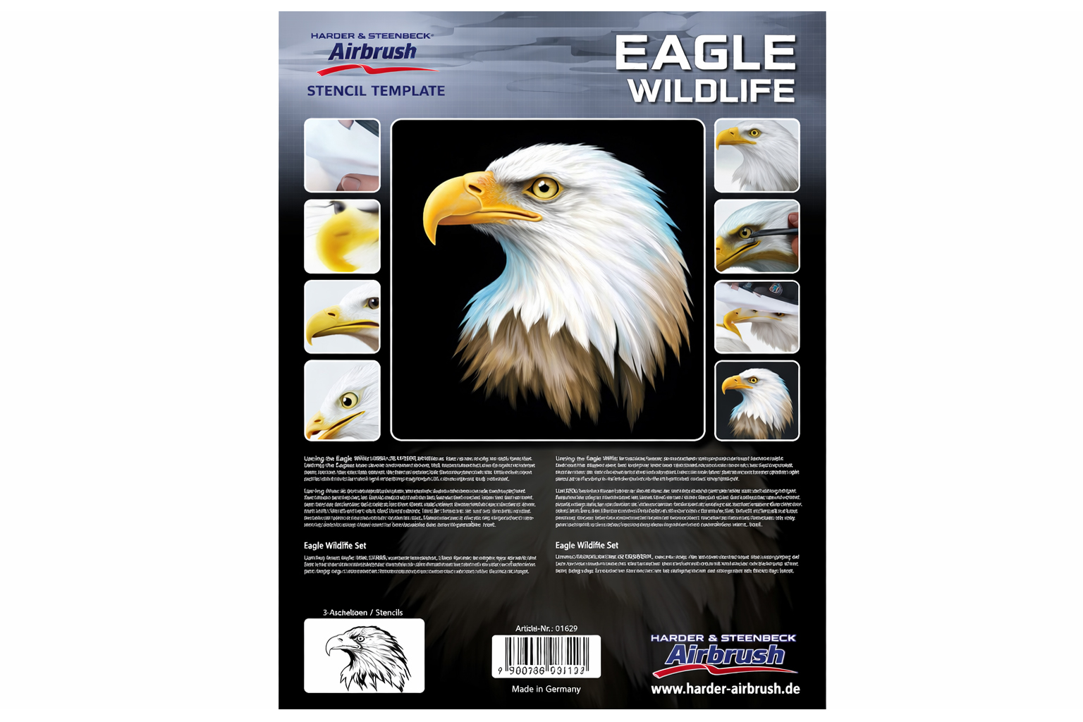 Create a striking bald eagle illustration with ease using the Harder & Steenbeck Eagle Wildlife airbrushing stencil set.