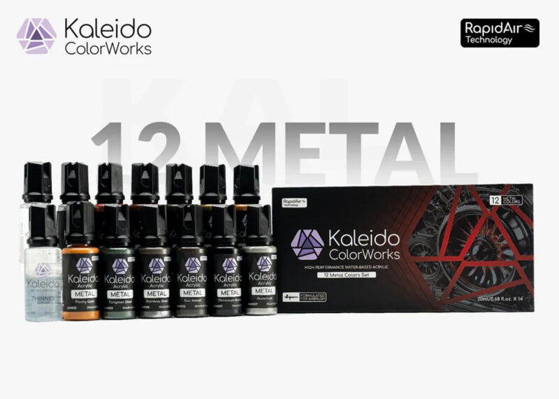 The Kaleido ColorWorks RapidAir Metal Series from Gaahleri is a premium water-based acrylic paint range developed for creating realistic metallic finishes with smooth, high-performance spraying. Using an eco-friendly, non-toxic, and solvent-free formula, each colour is factory pre-thinned for direct use or further dilution. Powered by RapidAir Technology, these paints solve common issues with metallic pigments—such as uneven coverage, streaking, or sagging—by applying in a consistent, sheet-like layer.