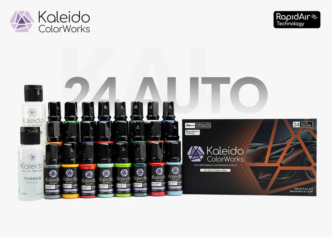 The Kaleido ColorWorks Auto Series delivers an extensive range of factory-matched automotive colours in high gloss, metallic, and pearl finishes. Designed for superior airbrushing performance, these premium water-based acrylics are eco-friendly, non-toxic, and solvent-free, with a factory pre-thinned formula ready for immediate use.
