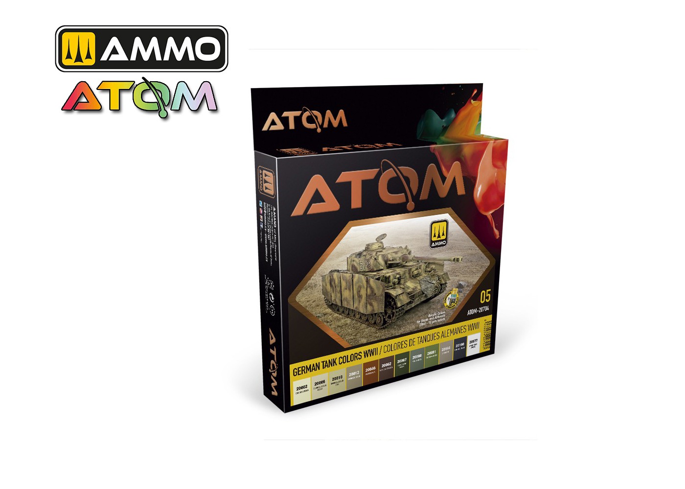 The AMMO by MIG Jimenez – ATOM German Tank Colors WWII Set is a selection of twelve ATOM acrylic paints, specially chosen to represent the camouflage used by Panzer units throughout World War II.