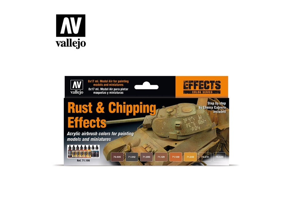 This Vallejo set provides everything needed to create realistic rust, chipping, and weathering effects on vehicles, aircraft, or ship models. Also includes primer, chipping medium, and varnish for professional results.