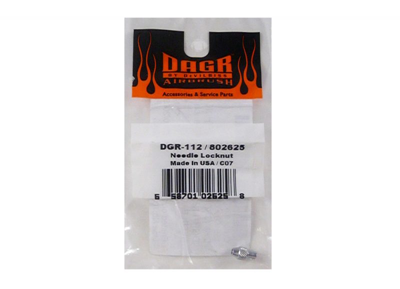 The DeVilbiss DAGR Needle Locknut secures the needle guide onto the needle, ensuring the needle moves smoothly with the trigger action.