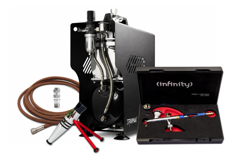 This premium airbrushing kit pairs the dependable Sparmax 610H Plus compressor with the Harder & Steenbeck Infinity Giraldez CRplus airbrush, delivering a high-performance setup designed specifically for miniature painting, scale modelling, and fine detail work.