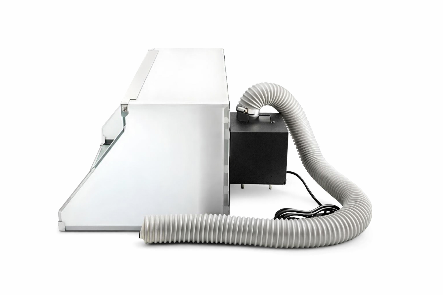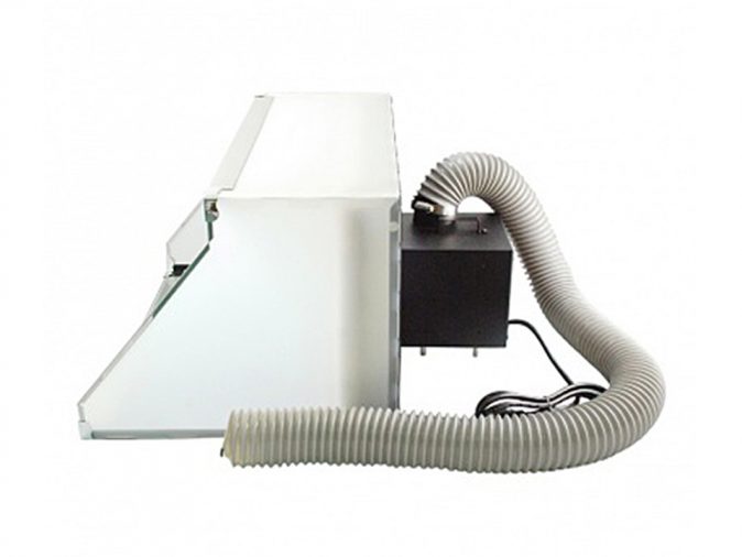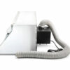• The booth includes a long, flexible exhaust hose that allows for portable setup and easy venting through a window or standard vent.
