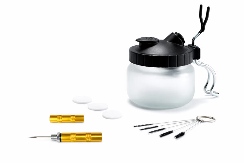- Airbrush Cleaning Kit – essential tools for cleaning and maintaining your airbrush including airbrush cleaning pot, cleaning brushes and nozzle reamer.