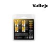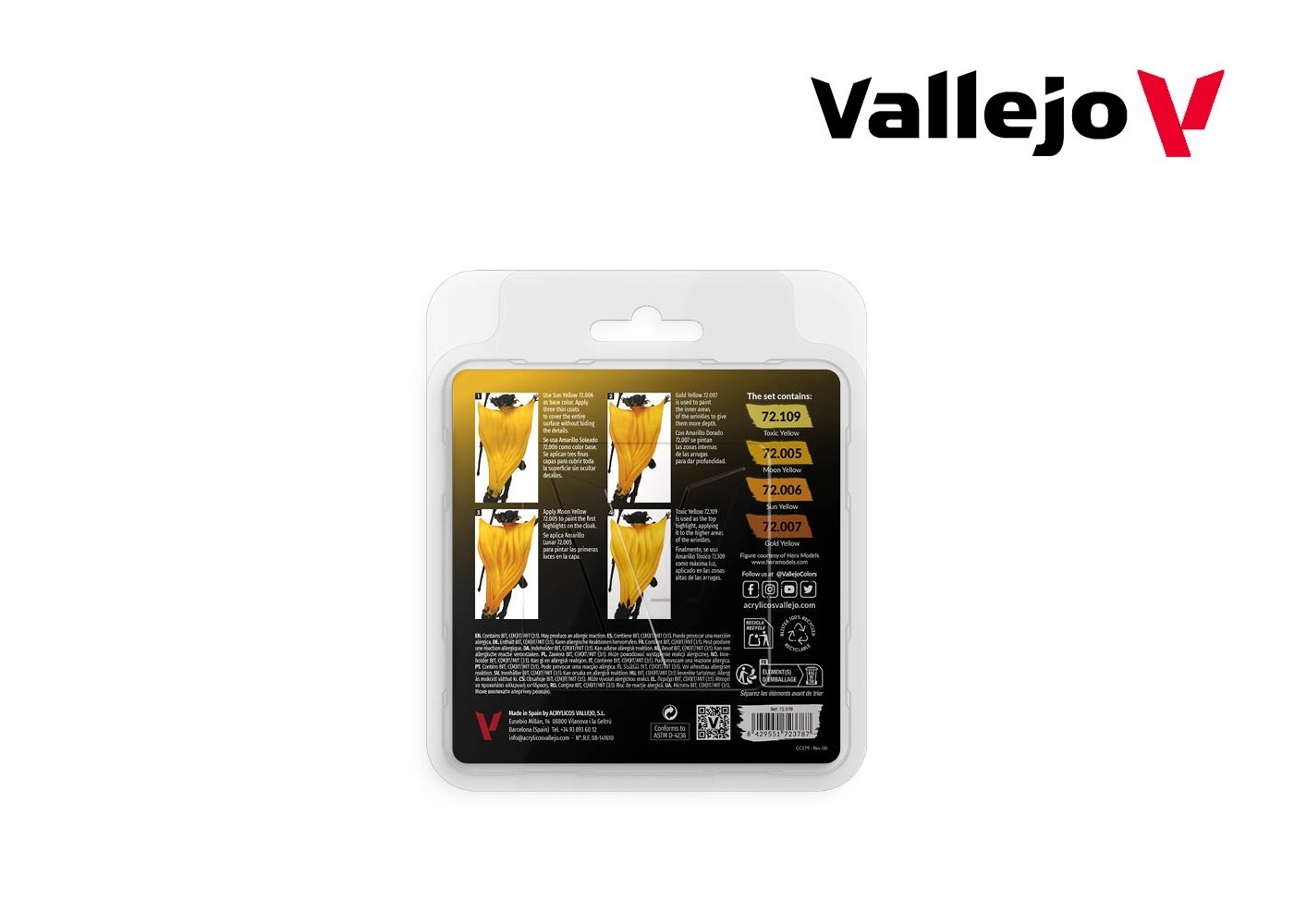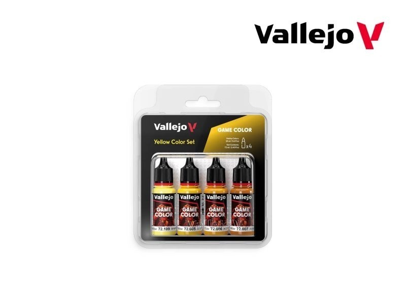 This Vallejo Game Color set features four vibrant, high-opacity yellow shades. It includes a versatile collection with a base color, a shadow color, and two highlighting shades, allowing you to achieve rich and dynamic yellow effects on your miniatures.