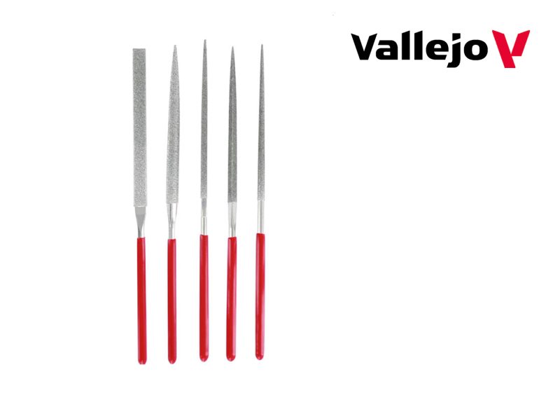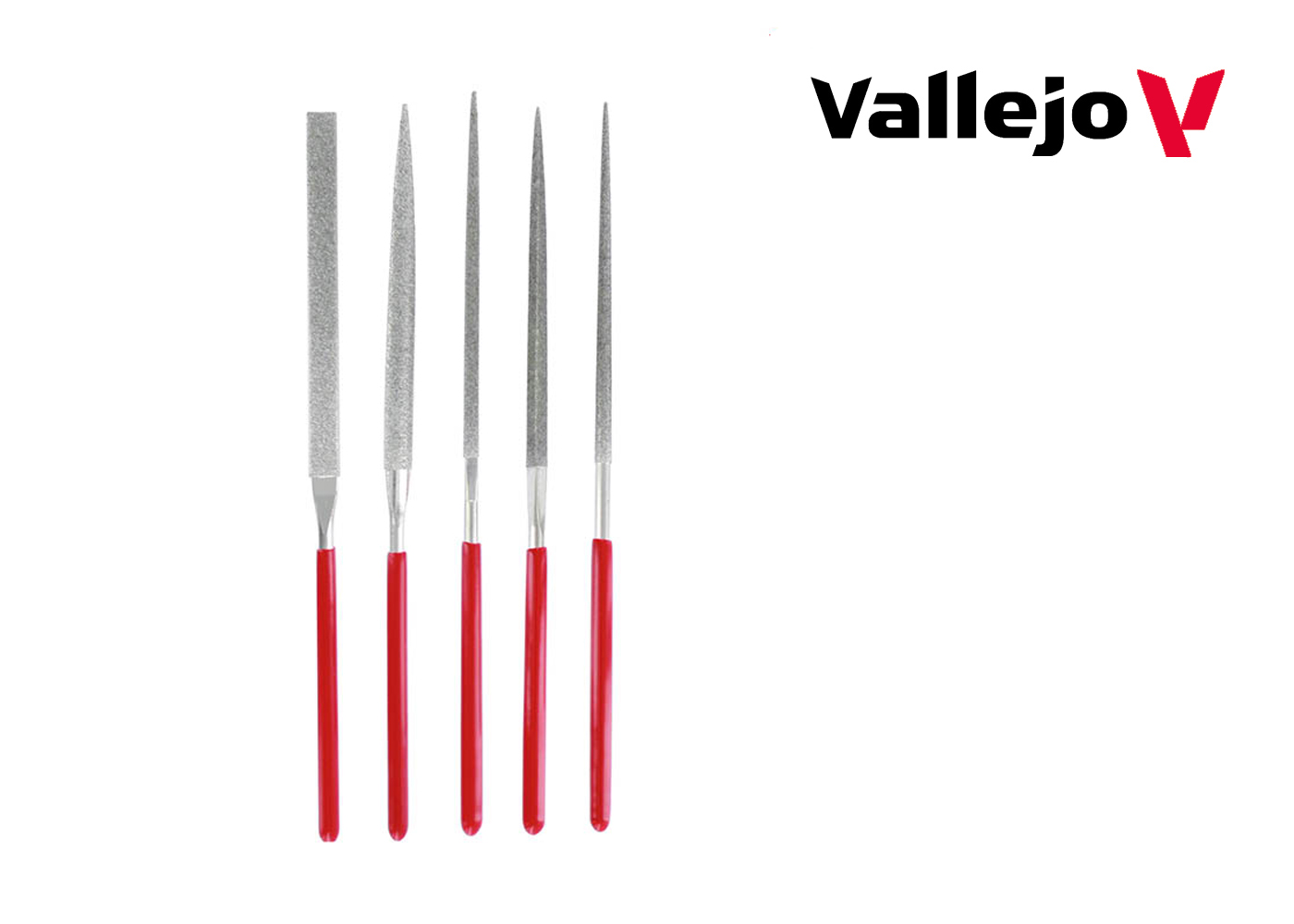 The Vallejo Diamond Needle File Set (5 pcs) is a high-precision tool collection designed for detailed filing tasks on plastics, metals, and other modeling materials.