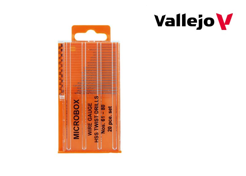 The Vallejo Microbox Drill Set gives you 20 high-speed steel drill bits for all your precision modeling needs. The handy slide-top box keeps your drills organized, releasing only the one you choose to prevent mix-ups. This set is fully compatible with the Vallejo Spin Top Pin Vice for comfortable and accurate drilling.