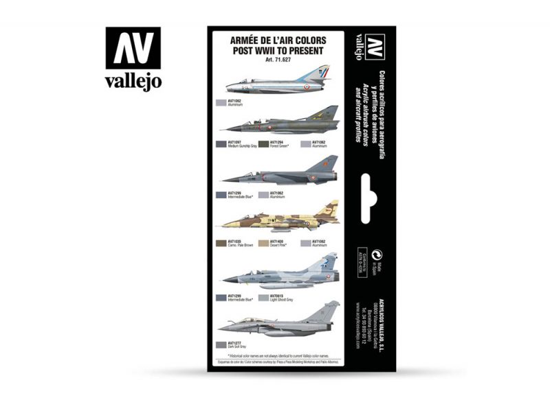 Each colour is formulated in Vallejo Model Air’s airbrush-ready acrylic range, ensuring smooth application and consistent results. The set also comes with aircraft profile guides and detailed camouflage references, making it easier to paint authentic Armée de l’Air schemes across different eras.