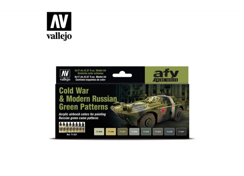 This Vallejo Model Air set contains eight airbrush-ready Model Air acrylics, carefully selected to replicate the camouflage patterns used on contemporary Soviet combat vehicles. The set is based on official URSS references and includes both historical and up-to-date camouflage schemes.