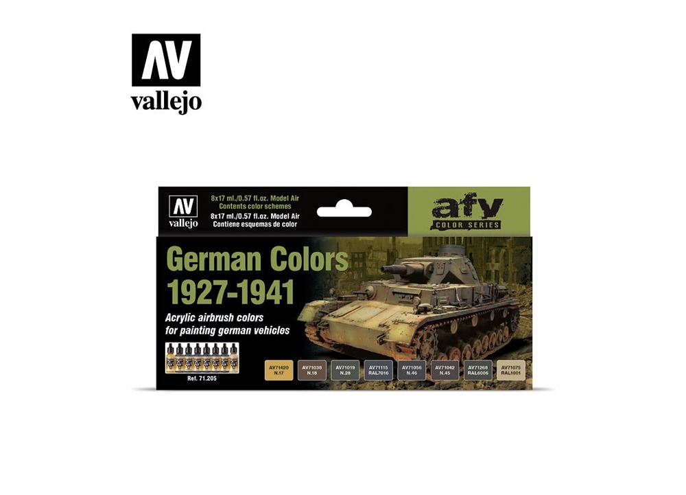 The Vallejo Model Air German Colours 1927–1941 Set provides all the essential airbrush-ready colours for accurately painting German vehicles from 1927 to 1941.