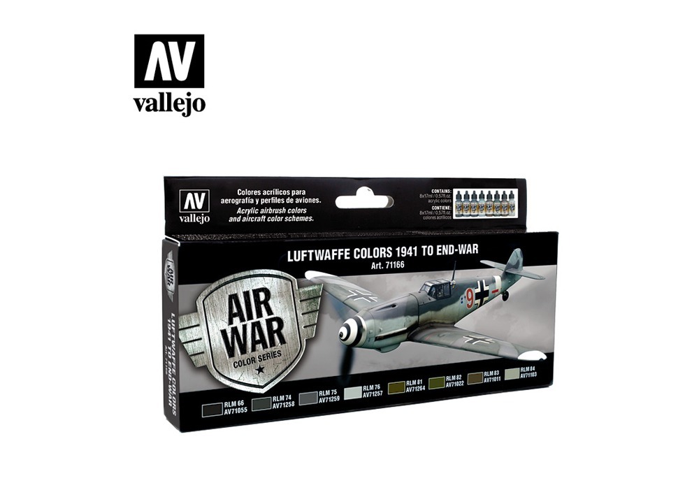 Set of Model Air colors developed for the camouflage patterns of all Luftwaffe models of fighters (single-engine, heavy and night fighters) starting in 1941, as well as the colors employed towards the end of the war (1944-45) on the latest models of interceptors, and on the revolutionary new jets and latest model aircraft.