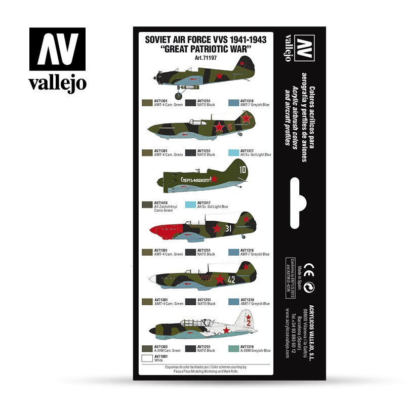 • This Vallejo Model Air set provides eight airbrush-ready colours for painting Soviet Air Force aircraft from 1941 to 1943 – 71.1197