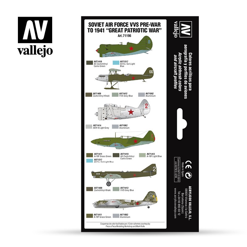 The Vallejo Model Air Soviet Air Force VVS Pre-War to 1941 Set provides eight airbrush-ready colours for painting Soviet aircraft from the years prior to World War II up to the USSR’s entry into the conflict in June 1941.