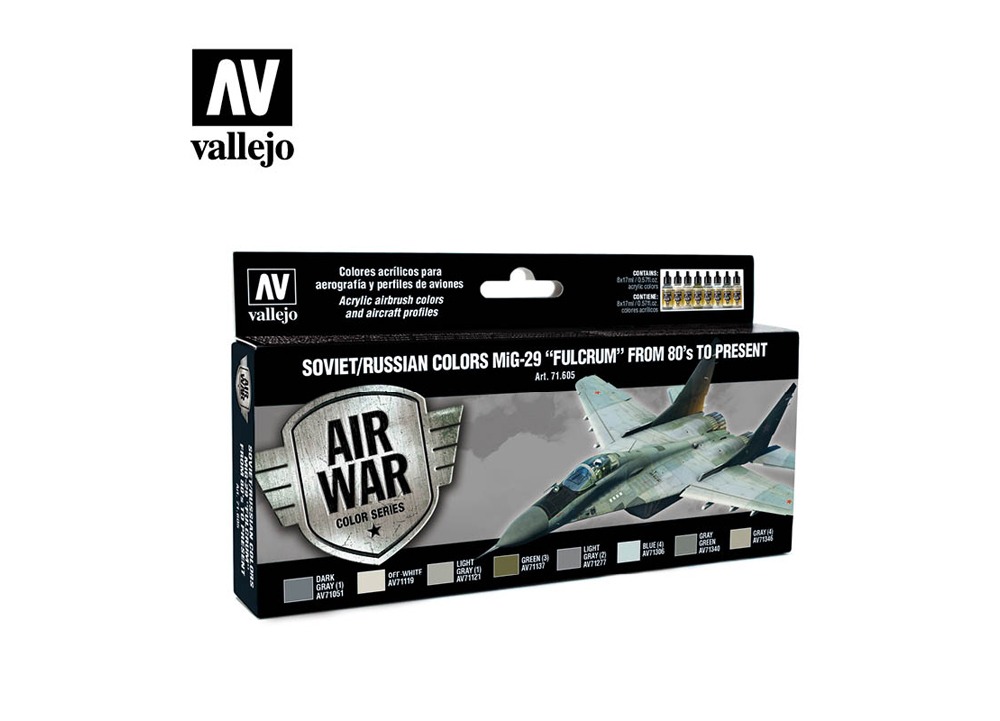 The Vallejo Model Air MiG-29 “Fulcrum” Set includes eight carefully selected Model Air colours, developed for painting the MiG-29 “Fulcrum” fighter aircraft of the Soviet and Russian Air Forces, deployed from the Cold War into the present day.