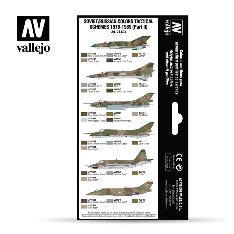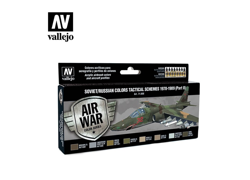 The Vallejo Model Air Soviet Tactical Schemes 1978–1989 (Part II) Set provides eight authentic acrylic colours developed for airbrushing Soviet aircraft during the late Cold War era and the years leading up to the collapse of the Eastern Bloc.