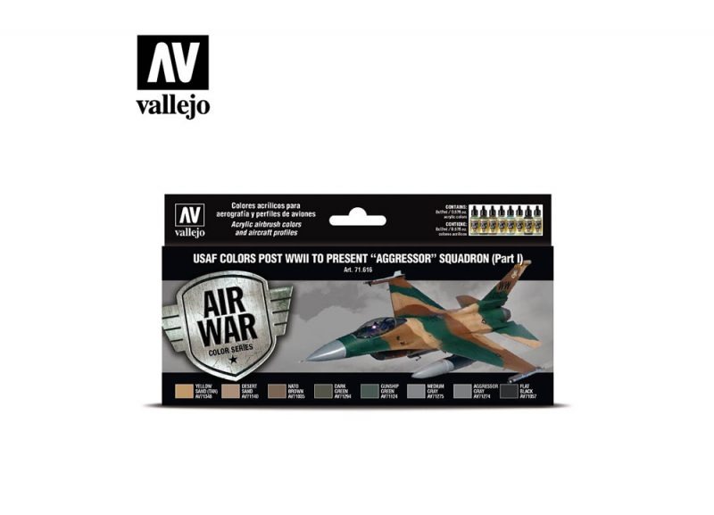 This Vallejo Model Air set contains eight airbrush-ready Model Air acrylics, developed to recreate the brown and green camouflage patterns used by the USAF “Aggressor” Squadrons. It includes six detailed aircraft profiles, highlighting planes deployed during the “Red Flag” maneuvers of 2017 and 2018.
