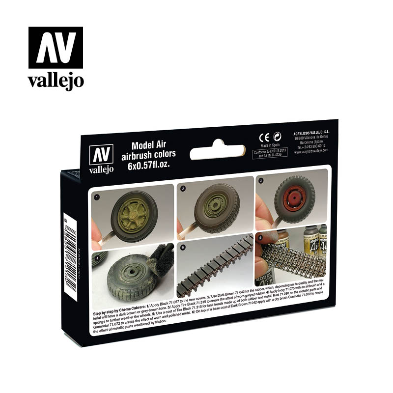 The Vallejo Model Air Wheels and Tracks Set includes six carefully selected colours designed for realistic representation of rubber tyres, track links, and metal effects on modern and Second World War AFVs. This set allows modellers to recreate rubber textures, rusted tracks, polished metal surfaces, and dust effects with precision. The Ivory colour is perfect for adding dust and weathering effects with an airbrush.