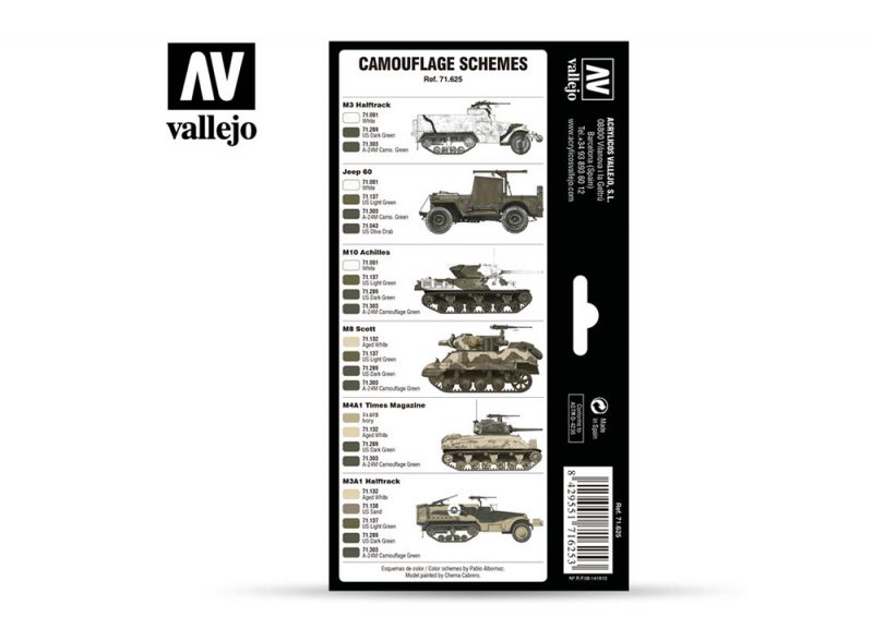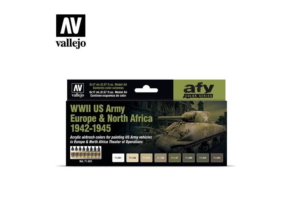 This Vallejo Model Air set brings together eight precision-formulated acrylic colors designed to recreate the camouflage patterns of US Army vehicles during World War II. Covering operations across Europe (ETO), the North African campaign, and even winter camouflage schemes, it provides all the essential tones used as both base coats and camo highlights.