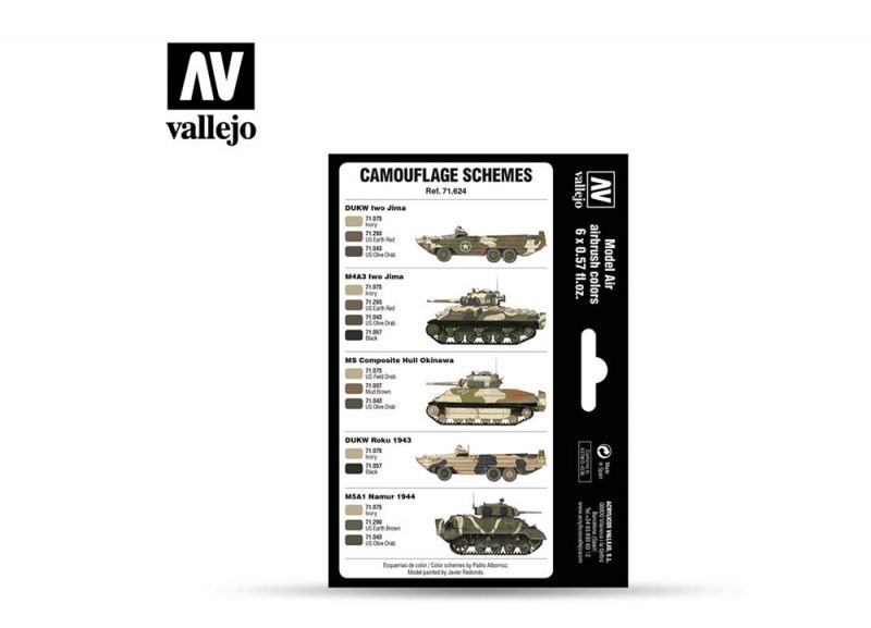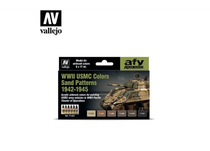 This Vallejo Model Air set includes six historically accurate colors designed to recreate the camouflage schemes used by the United States Marine Corps (USMC) during World War II. Covering vehicles deployed in iconic battles such as Okinawa and Iwo Jima, these tones capture the distinctive sand and earth camouflage patterns applied in the Pacific theater.