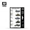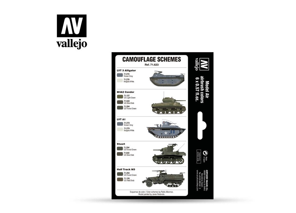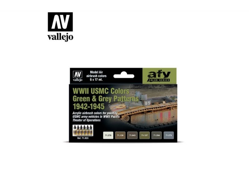 This Vallejo Model Air set includes six authentic colors designed to replicate the camouflage schemes used by the United States Marine Corps (USMC) during World War II. The selection features the essential Ocean Grey, applied to AMTRAC units operating in Saipan, Tarawa, and other amphibious landing zones, alongside key greens and drabs used in combat camouflage.
