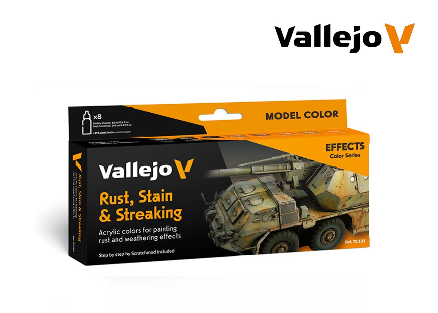 This Vallejo paint set contains 8 carefully selected colours designed to reproduce realistic weathering effects, including rust stains, streaking, peeling, and surface wear caused by exposure. Perfect for adding depth and realism to vehicles, scenery, and dioramas, it combines Model Color, Model Air, and Wash FX paints.