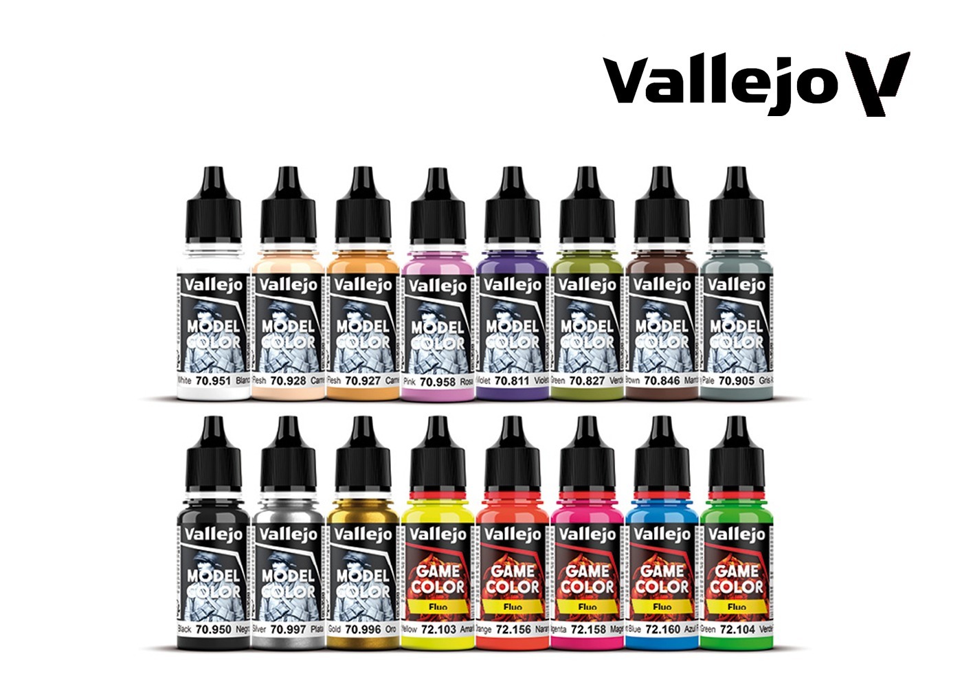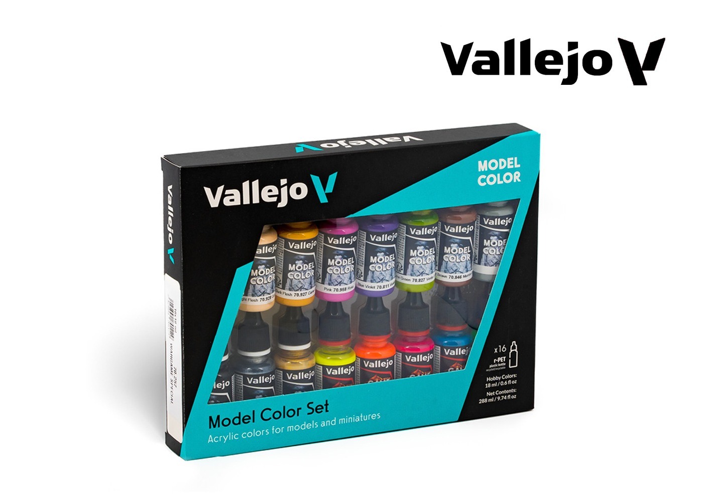 The set includes 16 Vallejo acrylic colours in 18ml bottles, featuring both Model Color and Game Color ranges.
